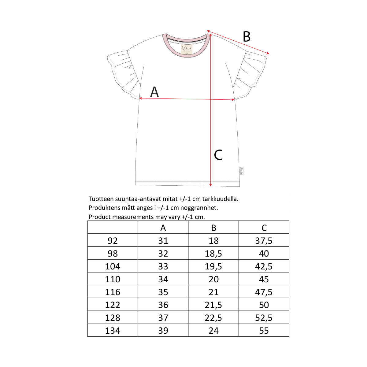 Lovely children’s short-sleeved t-shirt, in coral, have double frills on the sleeves. The shirt has a dropped shoulder line and a straight cut. The details and lovely colour make this a summer favourite, because it goes well with festive pieces and casual clothing.