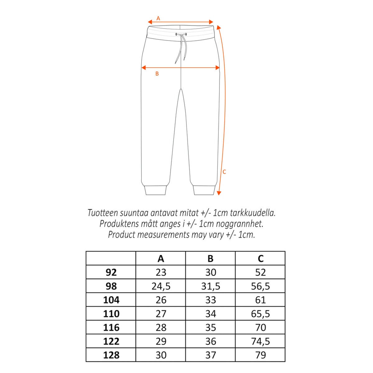 Children's Moomin track pants have an elastic waistband with a drawstring, and leg cuffs. The trousers feature the atmospheric Early Flight print and they are made from slippery polyester fabric that's easy to keep clean. Designed in Finland