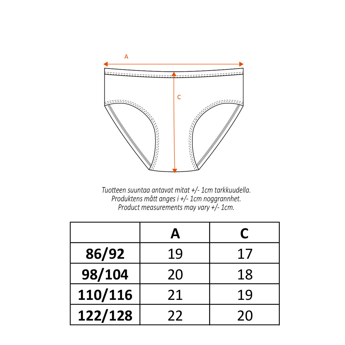 This package has two pairs of children’s underwear. The 2-pack has one pair with the adorable Flower wreath print, and the other pair with a print of Snorkmaiden wearing a flower wreath.
