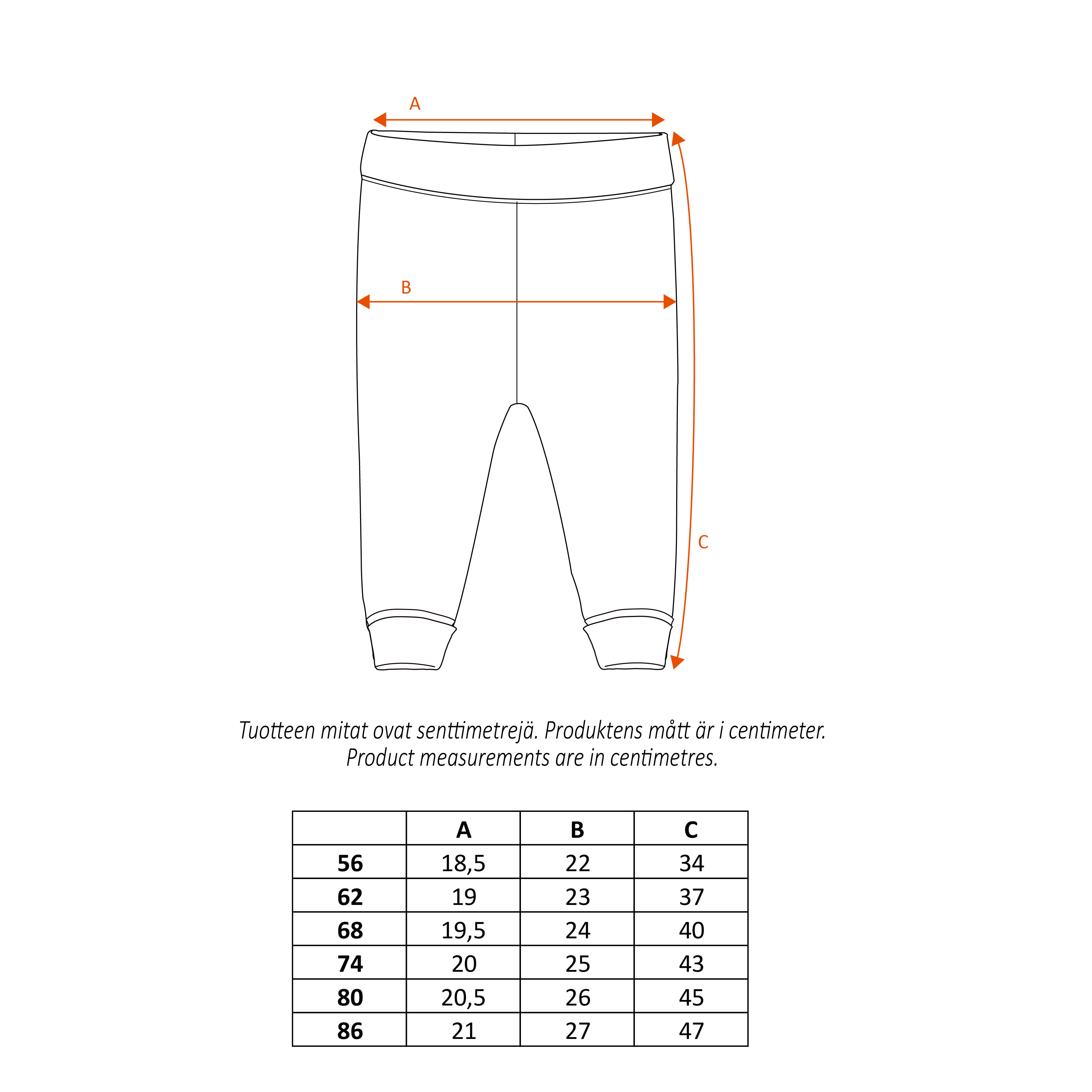 Pink babies’ full-length trousers have a reversible waistline and cuffs, and an adorable print of Snorkmaiden with a flower wreath. There are adorable, decorative frills in the back as well.
