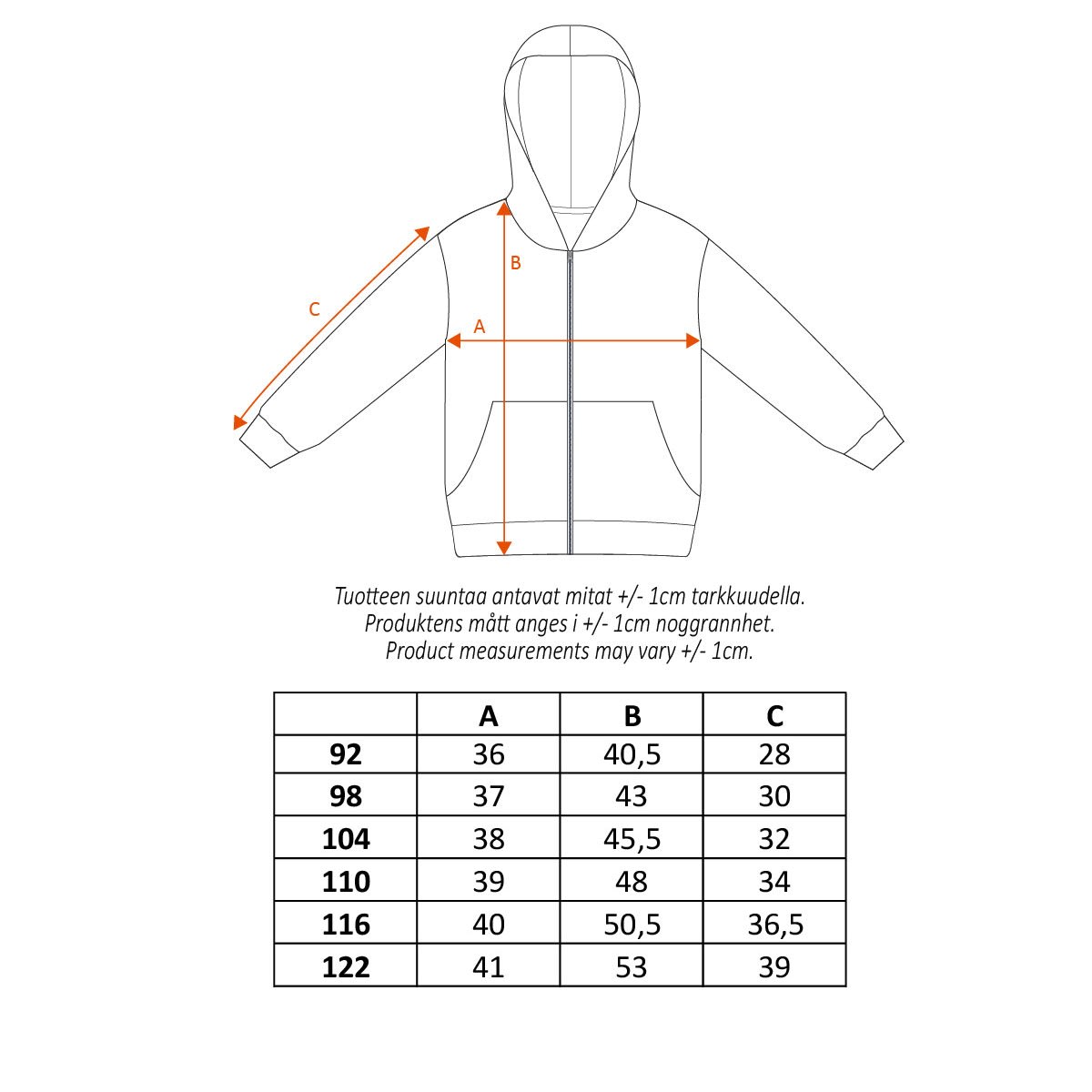 Children's Moomin hoodie has long sleeves, a lined hood, pockets, and a zipper closure. The hoodie jacket has a playful Hey Stinky print. The warm and soft hoodie is made from brushed French cotton. Designed in Finland.