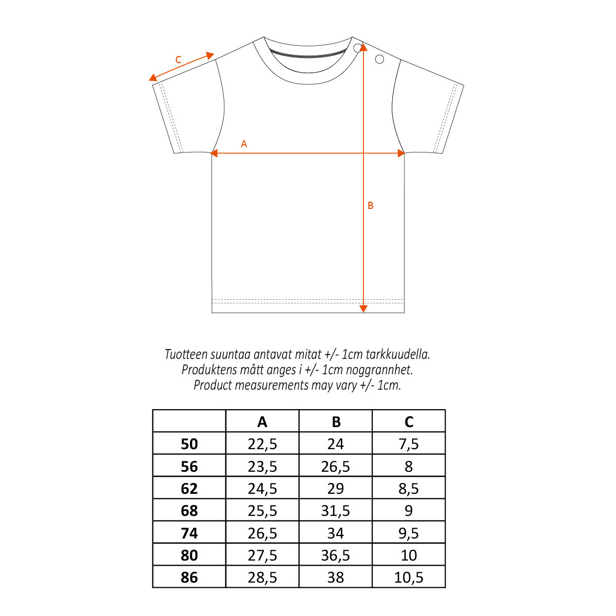 Pink babies’ short-sleeved t-shirt has snap buttons on the shoulders and a straight cut. The shirt has a print of Little My with a large flower wreath.