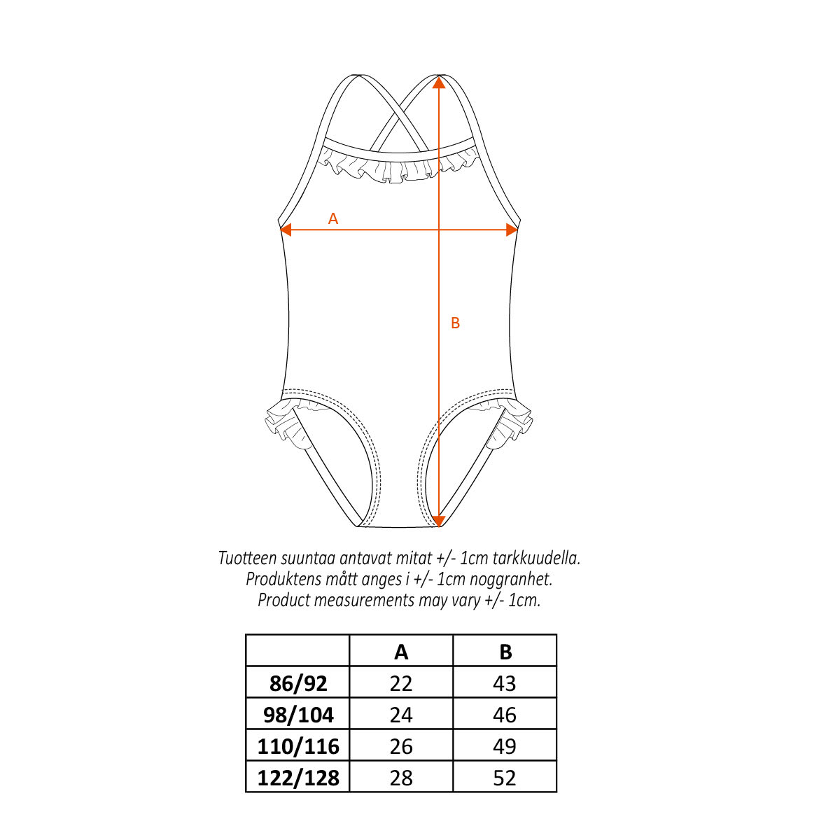 Rose-coloured swimsuit has delicate crossed shoulder straps and frills at the top and at the inseams. The straps make the swimsuit fit well and the lined front is not see-through. The swimsuit has the tasty yellow print of Little My eating a papaya.