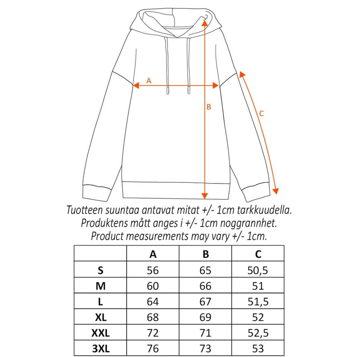 Natural white long-sleeved hoodie has a hood, a loose and relaxed fit, and a lighter loopback finish on the inside. On the chest is a sketch of Snorkmaiden with butterflies.