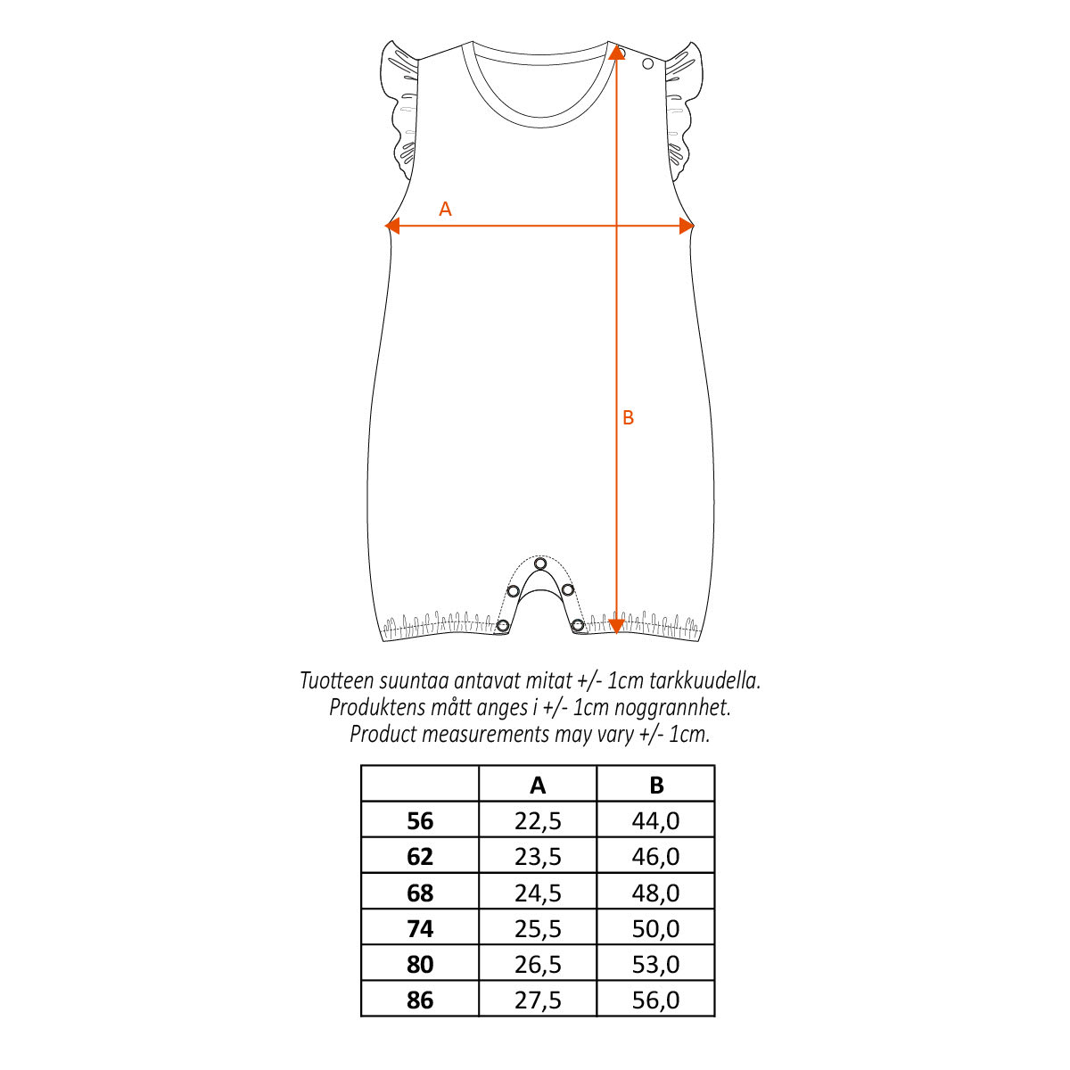 White babies’ sleeveless playsuit has a lovely cut and adorable shoulder frills. The babies’ playsuit has the colourful and floral Summerly print.