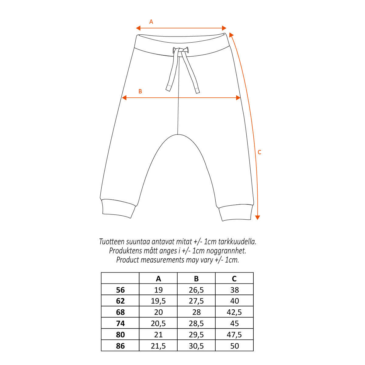 Blue babies’ full-length trousers are comfortable to wear, they have diaper room and they are brushed soft on the inside. There are joyful pictures of Moomintroll throwing cartwheels.