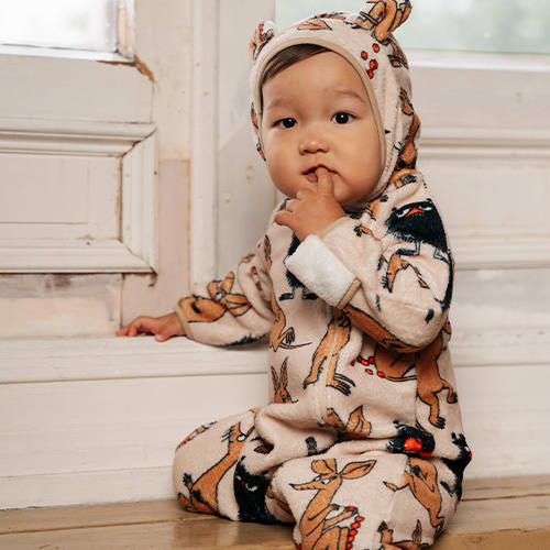 This print is available for babies in a long-sleeved bodysuit, a pyjama, and a scarf. For larger children, this print is available in a long-sleeved shirt.