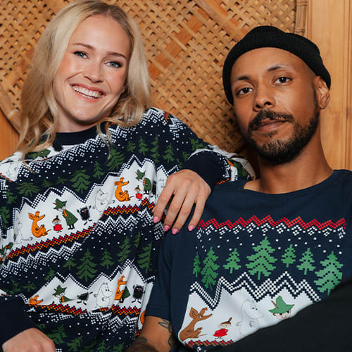 Our family pyjamas, college shirts, and overalls are available for everyone, from babies to adults. These are the perfect attire for family Holiday cards and for lounging at home during the holiday season. T-shirts and fluffy and regular socks bring a finishing touch to this collection. Come and enjoy the holiday season with the Moomins!