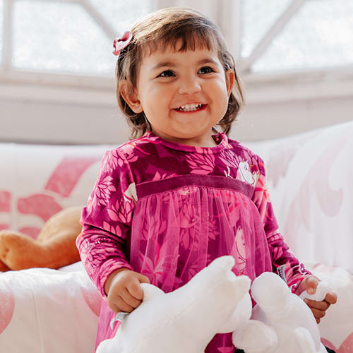 The pink Bakers print is very energetic, and it is available for babies in a long-sleeved bodysuit, pyjama, our classic bodysuit dress and leggings. For larger children, the print is available in an adorable dress, shirt, and leggings. We are adding a babies' bib to this collection soon, stay tuned!