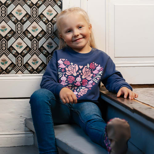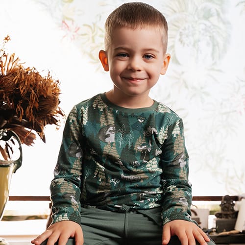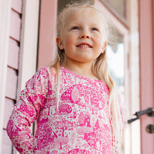 The rich and multicoloured Decoration print pops up beautifully against the dark blue fabric. This charming print is available for babies in a long-sleeved bodysuit, pyjama, and our classic bodysuit dress. For larger children, the print is available in a lovely flowy-hemmed dress, a heartfelt college shirt and a long-sleeved shirt. We are adding a babies' bib to this collection soon, stay tuned!