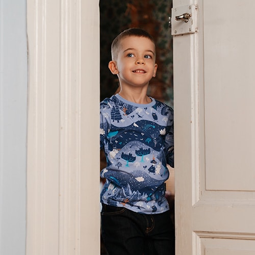 This charming print is atmospheric and playful in shades of blue, and it is available for babies in our classic long-sleeved bodysuit and pyjama, as well as our new arrival, a bodysuit shirt! This new product has a bodysuit bottom under a long-sleeved shirt. This keeps the shirt from riding up. For children, the print is available in a long-sleeved shirt.