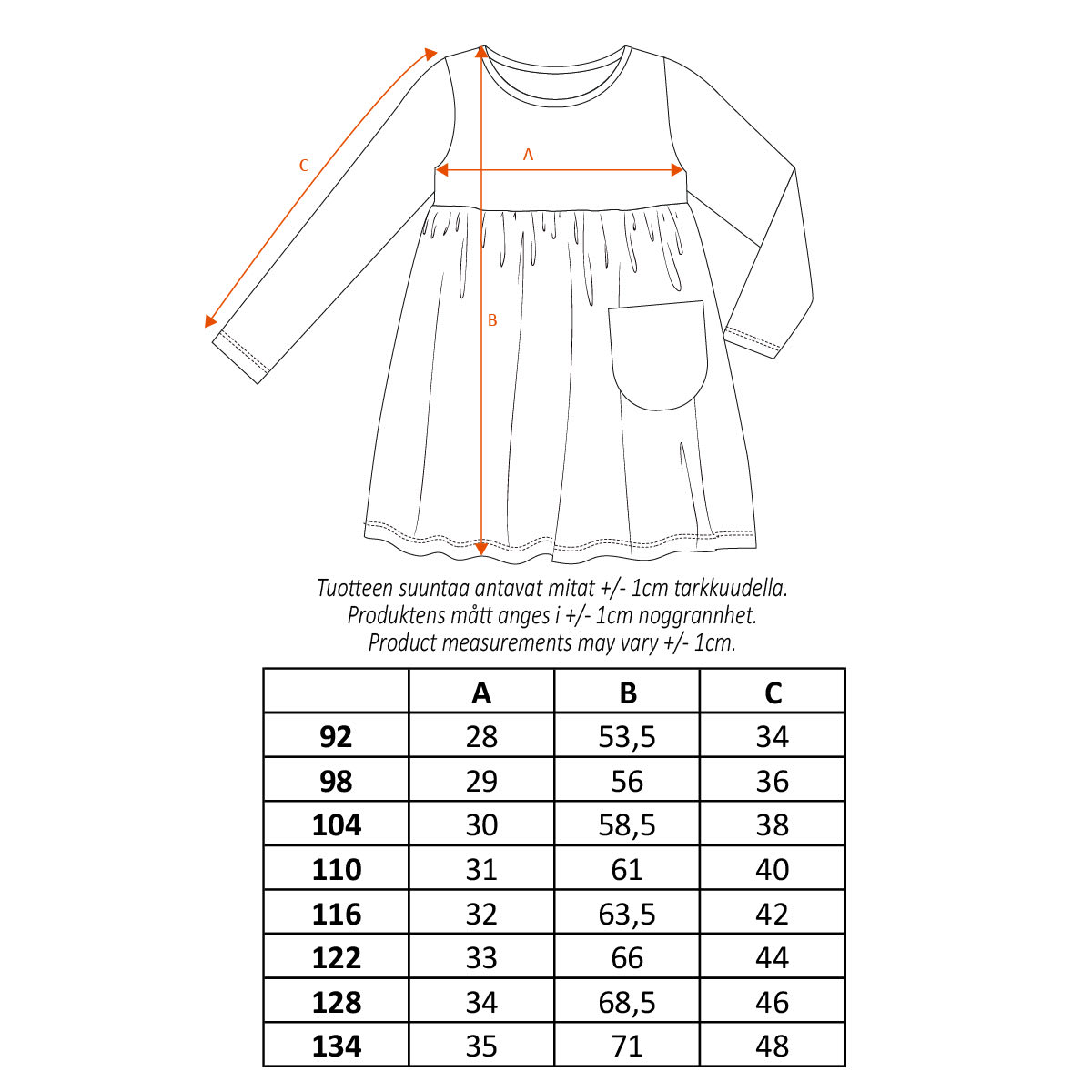 Children's soft Pippi Longstocking dress has a fun speckled print with Pippi and her friends. The A line dress is made from organic cotton lend, has long sleeves, a round hem, long neckline, and one patch pocket. 95 % certified organic cotton, 5 % elastane. Designed in Finland.