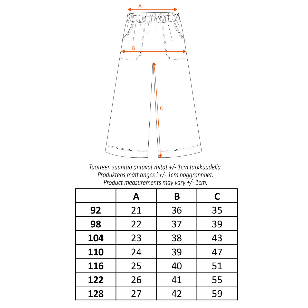 Stripy children’s full-length trousers have an elastic waistline, wide legs, and large pockets. The trousers have pink-and-red stripes, and one leg has a print of Pippi and Lille Gubben, with a text: Be more Pippi on the pocket.
